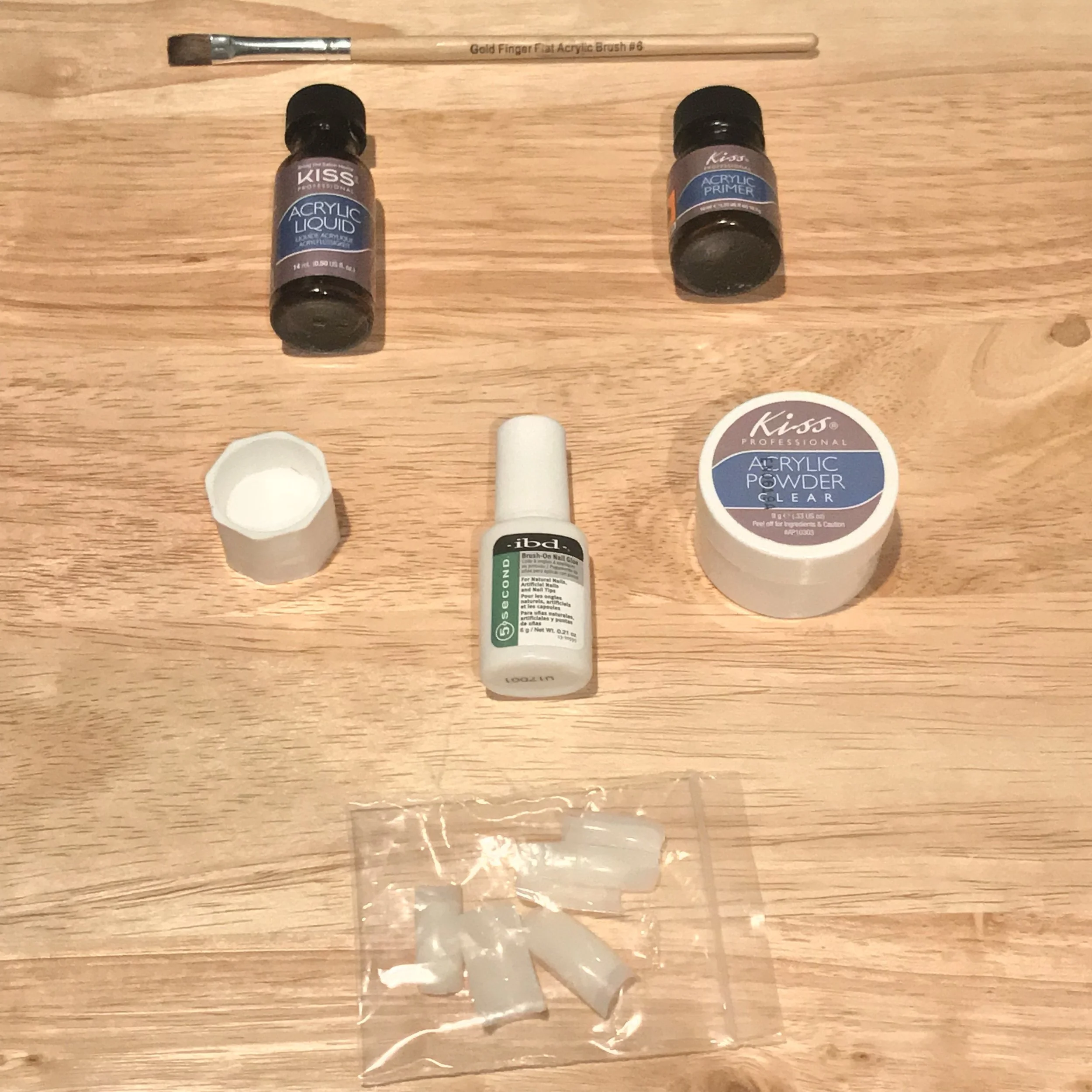Above I have the application brush, the acrylic liquid, primer and powder in clear. The little white thing that I don’t know the name of, but you put the acrylic liquid into for dipping. Nail glue in a brush on form and a pack of twenty nails.