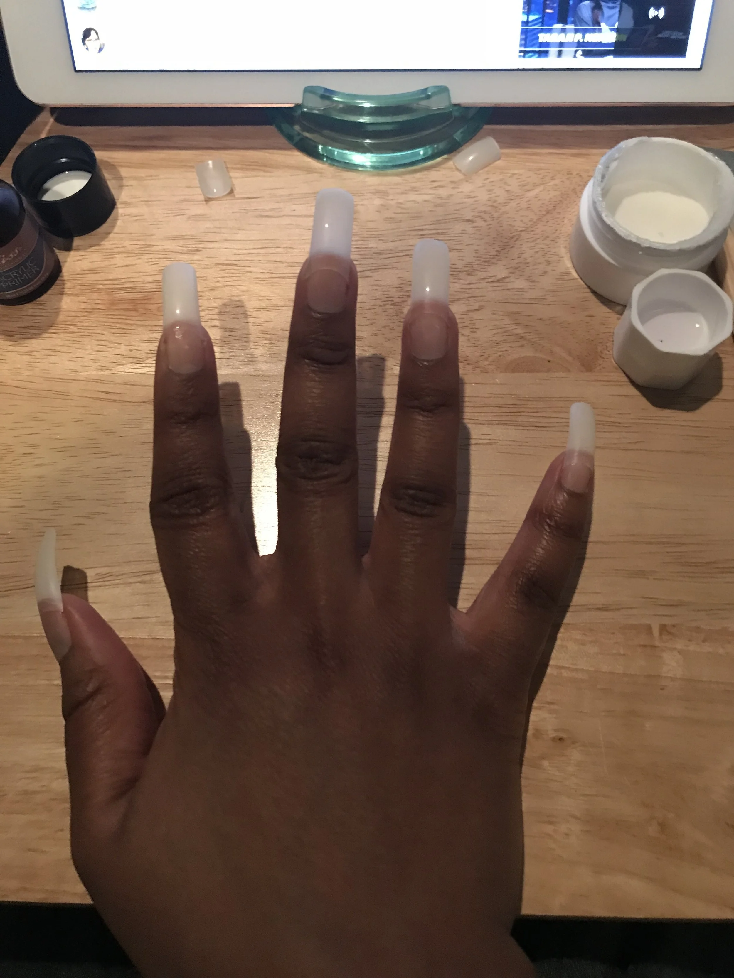 I then proceeded to apply the primer to my nails and then the acrylic. I poured the acrylic liquid into the little white cup and dipped the brush into it. I then dipped the brush into the acrylic powder and made a ball with the tip of the brush; just like I’ve seen them do at the nail shop a million times over, and applied it to each nail.